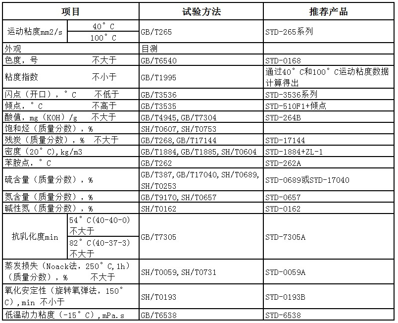 (1)外观(色度)(2)密度(3)粘度(4)粘度指数(5)闪点(6)凝点和倾点(7)酸值、碱值和中和值(8)水分(9)机械杂质(10)灰分和硫酸灰分(11)残炭