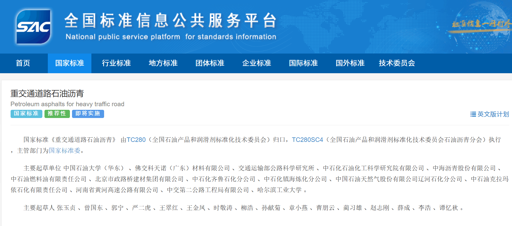 四、标准实施意义 1. 工程价值 延长重载道路使用寿命,减少车辙、裂缝等病害 提升道路服役安全性(高温稳定性与低温抗裂性优化) 2. 产业协同 中国石油大学(华东) 、佛交科天诺(广东)材料有限公司 、交通运输部公路科学研究所 、中石化石油化工科学研究院有限公司 、中海沥青股份有限公司 、中石油燃料油有限责任公司 、北京市政路桥建材集团有限公司 、中石化齐鲁石化分公司 、中石化镇海炼化分公司 、中国石油天然气股份有限公司辽河石化分公司 、中石油克拉玛依石化有限责任公司 、河南省黄河高速公路有限公司 、中交第二公路工程局有限公司 、哈尔滨工业大学起草 。产学研结合推动行业技术标准化 3. 国际接轨 分类体系与检测方法参考国际标准 助力国产沥青参与全球竞争