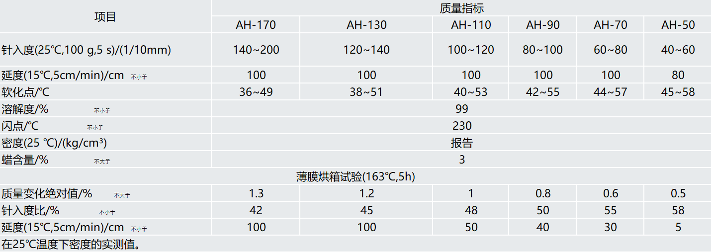 (二)核心技术指标 1. 关键检测项目 针入度(GB/T 4509):评估稠度 延度(GB/T 4508):低温抗裂性 软化点(GB/T 4507):高温稳定性 蜡含量(NB/SH/T 0425):控制低温性能劣化 2. 薄膜烘箱试验要求 质量变化绝对值:从AH-170的≤1.3%到AH-50的≤0.5% 延度保留值:AH-170至AH-70≥30cm,AH-50≥5cm