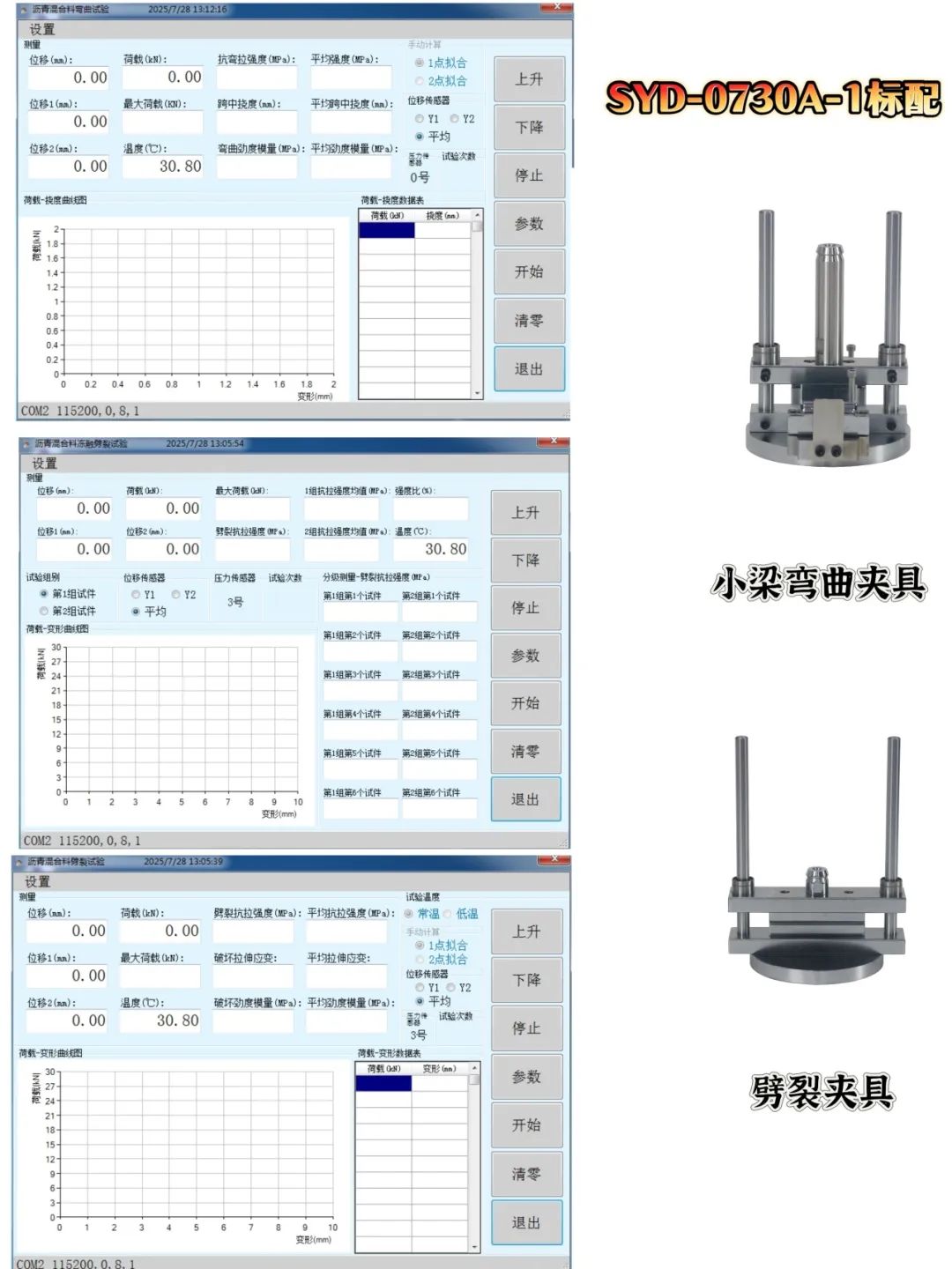 10、仪器标配马歇尔稳定度试验夹具,劈裂试验夹具,冻融劈裂试验夹具,弯曲试验夹具,其余为选配。
