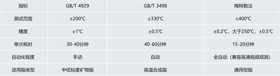 1. 梅特勒法(SYD-2806MA半自动、SYD-2806MB自动或半自动) 设备:全自动或半自动滴点(高清视频观测) 优势:兼容GB/T、ISO、ASTM等多项标准,支持在高达400°C(±0.2℃,大于250℃±0.5℃)的温度下同时测量两个样品,自动化控制升温速率自动判断试样滴点,节省时间和人力成本;具有快速加热和冷却功能,提升实验效率,缩短实验周期。 03 三、选型建议(按应用场景) 1. 常规质检(成本优先) 选GB/T 4929,适用于矿物油基润滑脂的出厂检验。 2. 高温/合成润滑脂研发 选GB/T 3498或梅特勒法,确保高温数据准确性(如航空航天润滑脂)。 3. 高精度实验室(效率优先) 选梅特勒法设备,支持全自动测试,效率高,减少人为误差。 4. 国际标准兼容性需求 梅特勒法优先,满足出口产品认证要求。