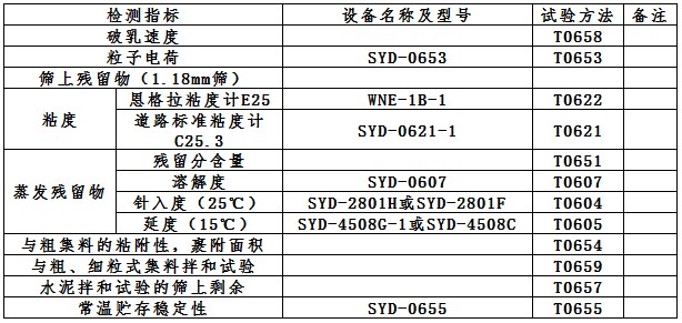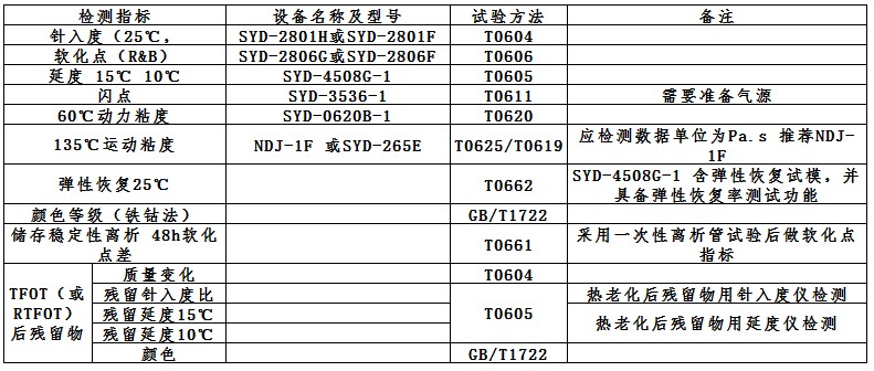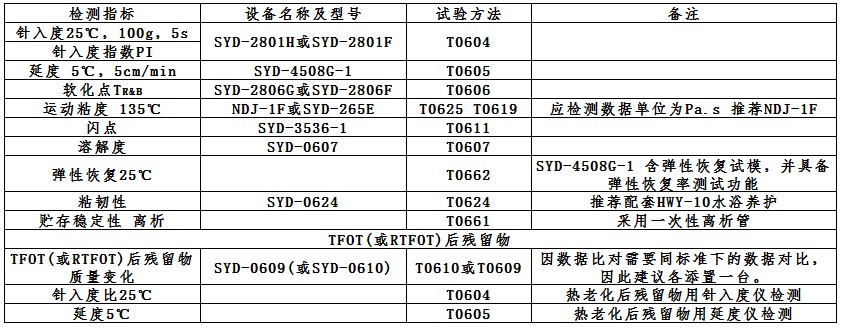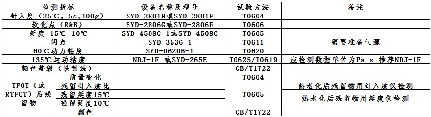 改性沥青产品主要也是供应公路施工使用,检测设备可参考公路沥青路面施工技术规范JTG F40-2004中相关类别技术标准中要求的实验设备。